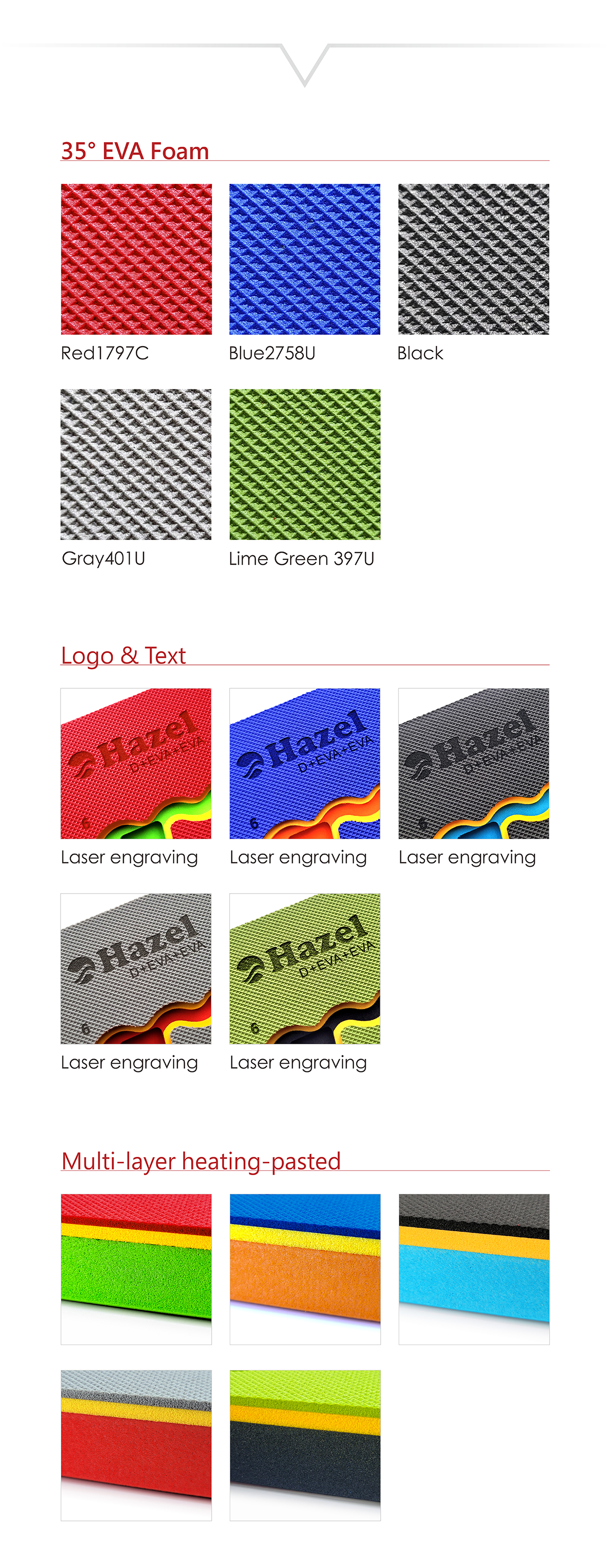 Product Name : Patented-Diamond grain EVA Foam tray for tools Ingredients : EVA Characterstic : Patented diamond texture. Rhombic surface. Logo or word can be clearly marked by laser.